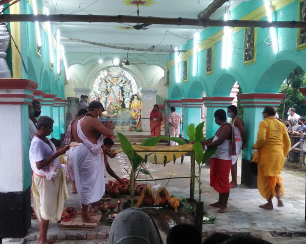 পুজো শুরু হলেই মণ্ডপ ভরে ওঠে ভাটিয়ালি সুরে। জেলেদের গান না হলে নাকি পুজোই অস্পূর্ণ! অন্যান্য পুজোর মতো চালায় নয়, পঞ্চমুণ্ডির আসন তৈরি করে সেখানে চলে দেবীর আরাধনা। অবাক হচ্ছেন? তবে এটাই সত্যি। কাঁথির কিশোরনগর রাজবাড়ির পুজো জুড়ে রয়েছে এমন নানা ইতিহাস, গল্পকথা। রাজবাড়ির সূত্রে জানা গিয়েছে, দেবীর নির্দেশেই পুজোতে ভাটিয়ালি গান গাওয়া হয়। কথিত রয়েছে, কয়েকশো বছর আগে ঝড়জলের রাতে এক সুন্দরী রমণী জেলেদের মশাগাঁ খাল পার করে দেওয়ার জন্য অনুরোধ করেন। জেলেরা তাঁর অনুরোধ মেনে খাল পার করে দিয়ে পয়সা চান। কিন্তু, সেই রমণী বলেন, “তোরা রাজবাড়িতে গিয়ে পুজোতে গান করবি। সেখান থেকেই পয়সা পাবি।” পাল্টা জেলেরা জানান, তাঁরা মূর্খ মানুষ। তাঁরা গান গাইতে জানেন না। তখন সেই নারী জানান তিনি তাঁদের জিভে গান লিখে দেবেন। জেলেরা বুঝতে পারেন দেবী তাঁদের কৃপা করেছেন। এরপরেই দেবীর নির্দেশে তাঁরা কাশীনগর রাজবাড়িতে গিয়ে উপস্থিত হন। কিন্তু, রাজবাড়ির কর্তা তথা রাজা স্পষ্টই জানিয়ে দেন জেলেদের রাজবাড়িতে বসে গান গাওয়ার অধিকার নেই। রাজাকে সব কথা খুলে বলতে তখন জেলেদের বাড়ির পশ্চিমদিকে বসে গান গাওয়ার অনুমতি দেওয়া হয়। জেলেরা গান শুরু করলে দেখা যায়, দেবীর অধিবাসের ঘটটি পশ্চিম দিকে ঘুরে গিয়েছে। এরপর থেকেই এই রাজবাড়ির পুজোয় চালু হয় জেলেদের গান। সে নির্দেশ আজও মেনে চলে রাজ পরিবার।